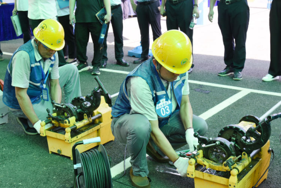DN20水表組的加工和安裝是每一位供水管道工人都會(huì )接觸的一項基礎工作,選手們使用專(zhuān)用設備,測量水表組安裝所需要的精準尺寸,再對管道進(jìn)行切割加工,并完成水表組的全部安裝。