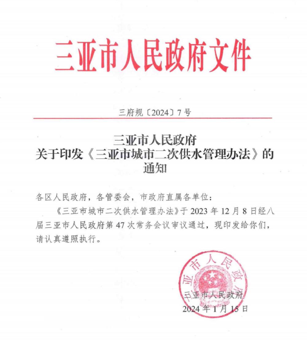 附件:三亞市人民政府關(guān)于印發(fā)《三亞市城市二次供水管理辦法》的通知(三府規〔2024〕7號 )