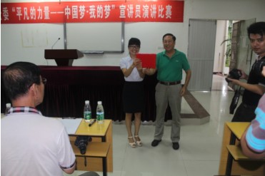 比賽現場(chǎng),參賽選手們懷著(zhù)熾熱的愛(ài)國情懷,以親歷、親為、親聞的鮮活生動(dòng)的事例,闡述了自己對中國夢(mèng)的理解和如何追求夢(mèng)想、實(shí)現夢(mèng)想。比賽中,由裁判員現場(chǎng)打分,經(jīng)過(guò)二個(gè)多小時(shí)的激烈角逐,最終產(chǎn)生一等獎1名、二等獎1名、三等獎1名、優(yōu)勝獎3名。我司選手蔡海芳喜獲此次宣講員比賽冠軍,并將代表國資系統參加全市宣講員比賽。
