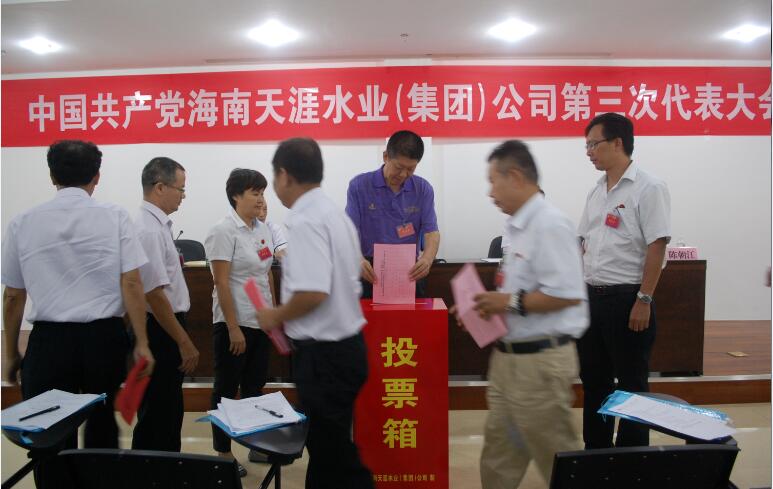 在莊嚴肅穆的氣氛中,黨委換屆選舉正式開(kāi)始,全體代表大會(huì )代表通過(guò)無(wú)記名投票和差額選舉的方式,秉承公開(kāi)、公平、公正的原則,選舉產(chǎn)生了新一屆黨委委員7名,分別是袁文革、周存榮、高元昌、孫瑜、陳朝東、陳濤、章梁;選舉產(chǎn)生了新一屆紀律委員會(huì )委員5名,分別是周存榮、劉卓毅、高喜英、邢維金、林照。隨后,中國共產(chǎn)黨海南天涯水業(yè)(集團)公司第三屆委員會(huì )和中國共產(chǎn)黨海南天涯水業(yè)(集團)公司紀律檢查委員會(huì )分別召開(kāi)了第一次全體會(huì )議,選舉袁文革同志為黨委書(shū)記,周存榮同志為黨委副書(shū)記;選舉周存榮同志為紀委書(shū)記,劉卓毅同志為紀委副書(shū)記。