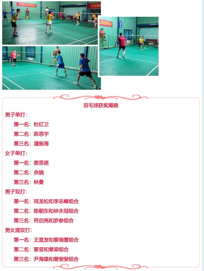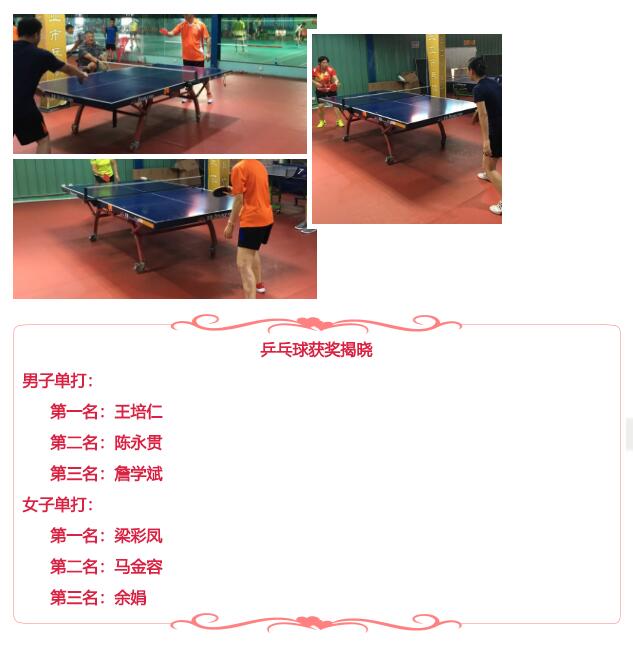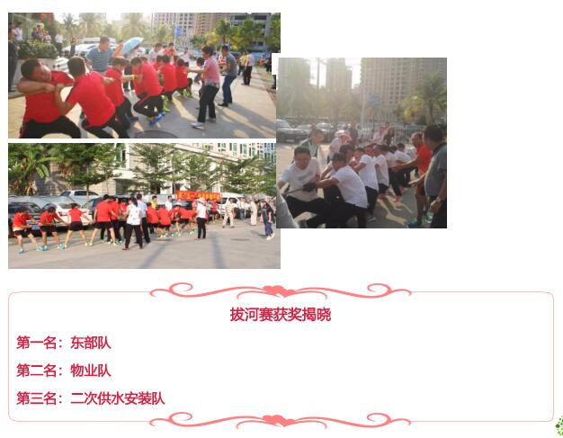 今年公司的"五一"活動(dòng),職工拔河賽共有五個(gè)隊參與競技,分別是機關(guān)隊、東部隊、西部隊、二次供水安裝隊和物業(yè)隊,比賽采用循環(huán)制和淘汰制相結合的方式,每場(chǎng)比賽采用三局兩勝制,比賽于24日下午在集團公司辦公大樓下舉行;羽毛球賽于25至26日在三亞海翔體育館舉行,共有四個(gè)隊參與競技,分別是機關(guān)隊、東部隊、西部隊和二次供水安裝物業(yè)隊,項目有男子單打、女子單打、男子雙打、男女混雙;乒乓球賽共有四個(gè)隊參與競技,分別是機關(guān)隊、東部隊、西部隊和二次供水安裝物業(yè)隊,項目有男子單打、女子單打,比賽采用循環(huán)賽和淘汰賽相結合的方式,每場(chǎng)比賽采用三局兩勝制,比賽于25日在海翔體育館舉行;男子籃球賽共有三個(gè)隊參與競技,分別是機關(guān)隊、東部隊和西部隊,比賽采用循環(huán)制, 以賽場(chǎng)勝負數進(jìn)行排名,比賽于25日至27日在三亞國興體育館舉行。各項比賽均設三個(gè)名次,每項比賽結束后,均由公司領(lǐng)導為獲獎?wù)哌M(jìn)行現場(chǎng)頒獎。