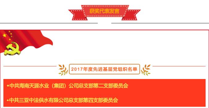 會(huì )議開(kāi)始,由黨委委員高元昌同志宣讀《中共海南天涯水業(yè)(集團)公司委員會(huì )關(guān)于表彰2017年度先進(jìn)基層黨組織、優(yōu)秀共產(chǎn)黨員和優(yōu)秀黨務(wù)工作者的決定》,通過(guò)表彰先進(jìn),激勵士氣,進(jìn)一步動(dòng)員廣大黨員干部職工解放思想,與時(shí)俱進(jìn),團結拼搏。大會(huì )對公司兩個(gè)先進(jìn)基層黨支部、24名優(yōu)秀共產(chǎn)黨員、5名優(yōu)秀黨務(wù)工作者進(jìn)行了表彰。先進(jìn)基層黨組織、模范共產(chǎn)黨員、優(yōu)秀黨務(wù)工作者代表結合自身成長(cháng)經(jīng)歷和工作實(shí)際在會(huì )上作了典型發(fā)言。