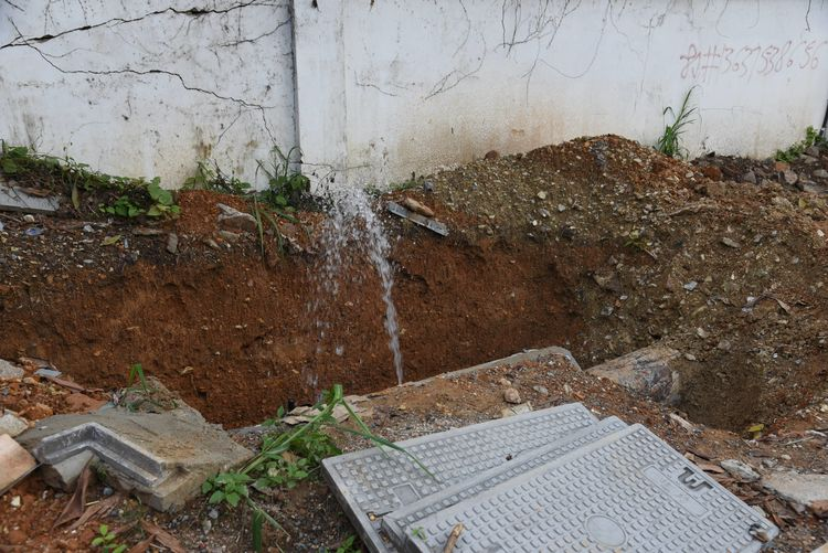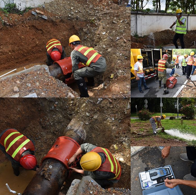 “三亞學(xué)院附近轉盤(pán)處DN400鋼管發(fā)生爆管,需要立即搶修!”二次供水公司在接到片區巡管員報告后,第一時(shí)間通知安裝公司搶修人員。安裝公司搶修隊在確認漏點(diǎn)位置后,立刻組織搶修人員和搶修物料緊急到達了現場(chǎng)。搶修隊員在現場(chǎng)設置隔離設施和警示標識,并嚴格按照標準搶修流程,關(guān)閉管道閥門(mén)、啟動(dòng)抽水泵將現場(chǎng)積水排干并在管身破損處安裝哈夫節以修復漏水點(diǎn)。哈夫節安裝完畢,二次供水公司通知巡管員開(kāi)閥排水,并在排水點(diǎn)取水樣進(jìn)行水質(zhì)檢測,在確認水樣合格后,巡管員報告搶修完成,搶修隊進(jìn)行清場(chǎng)工作,回填工作坑,至此,管道搶修順利完成。