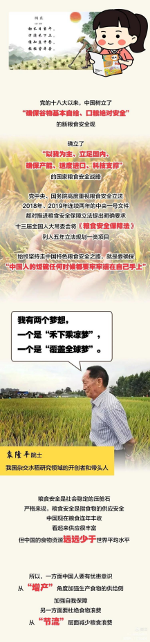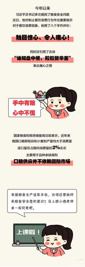 “誰(shuí)知盤(pán)中餐,粒粒皆辛苦。”盡管我國糧食生產(chǎn)連年豐收,對糧食安全還是始終要有危機意識,今年全球新冠疫情所帶來(lái)的影響更是給我們敲響了警鐘??倳?shū)記強調,要堅決制止餐飲浪費行為,切實(shí)培養節約習慣,在全社會(huì )營(yíng)造浪費可恥、節約為榮的氛圍。