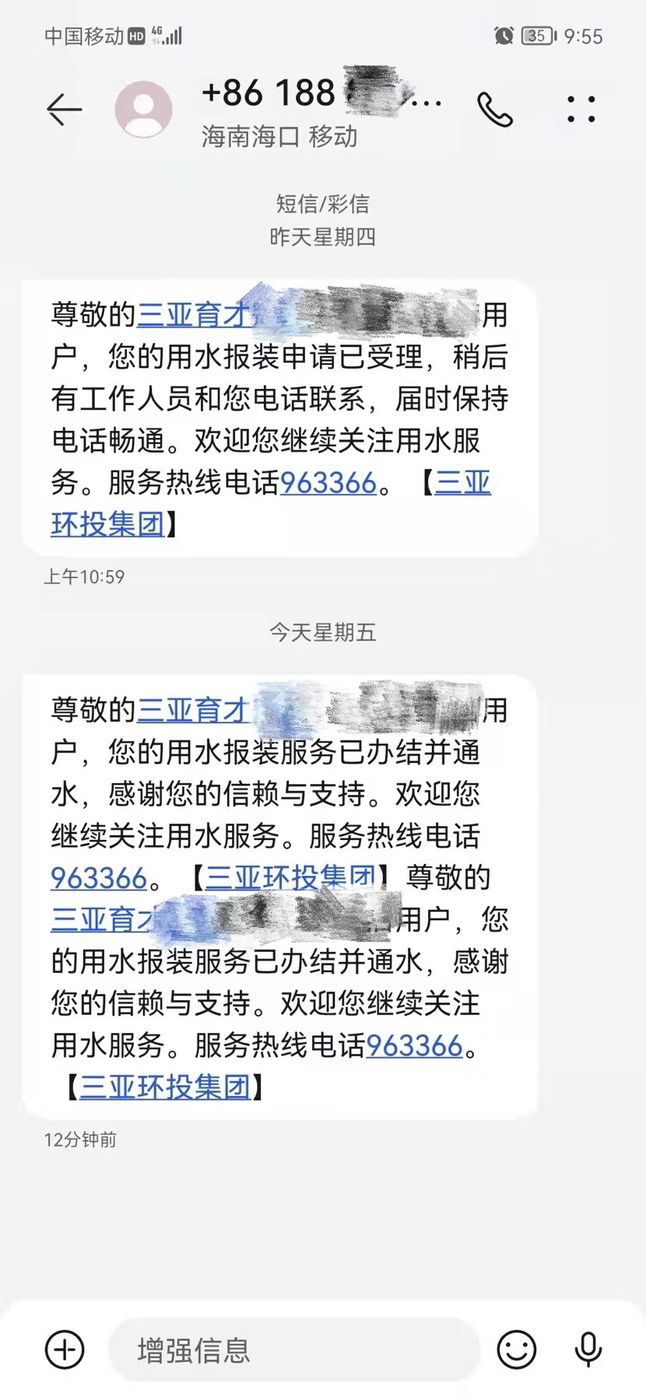 過(guò)去,用戶(hù)在辦理供水業(yè)務(wù),反映用水訴求后,無(wú)法確定所辦理的供水業(yè)務(wù)是否被受理,如果不在家中也不知道所反映的訴求是否解決。為解決這一問(wèn)題,打通便民利民的最后一公里,環(huán)投集團開(kāi)通了供水業(yè)務(wù)“受理提醒、辦結告知”的功能,用戶(hù)在辦理業(yè)務(wù)、反映訴求之后,系統后臺會(huì )根據用戶(hù)的需求,自動(dòng)針對業(yè)務(wù)類(lèi)型匹配并發(fā)送相應的短信,提醒用戶(hù)所辦理的業(yè)務(wù)已受理;在業(yè)務(wù)辦結后,系統會(huì )再次發(fā)送短信告知用戶(hù)業(yè)務(wù)已辦結。有了這項業(yè)務(wù),用戶(hù)就可以實(shí)時(shí)了解到業(yè)務(wù)辦理的最新動(dòng)態(tài)。