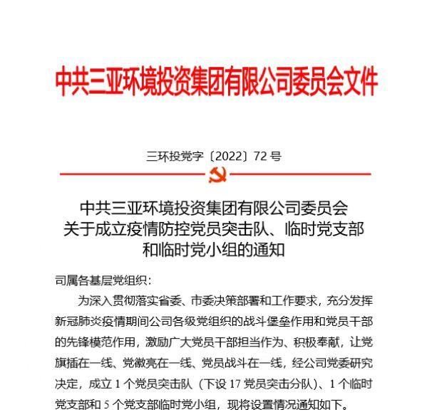 哪里有任務(wù),哪里就有黨組織的堅強堡壘;哪里有困難,哪里就有黨員沖鋒在前。面對當前嚴峻的疫情防控形勢和艱巨的防疫任務(wù),三亞環(huán)投集團黨委周密部署、迅速行動(dòng),于8月5日組織成立1個(gè)黨員突擊隊,下設17個(gè)黨員突擊分隊,1個(gè)臨時(shí)黨支部和5個(gè)黨支部臨時(shí)黨小組,為打贏(yíng)疫情防控阻擊戰提供堅強組織保障,確保守好三亞供排水安全的“生命線(xiàn)”,打好應急項目建設的“攻堅戰”和防疫志愿服務(wù)的“主動(dòng)仗”。