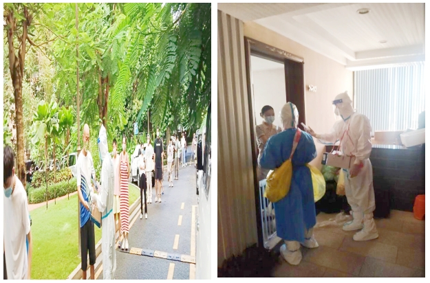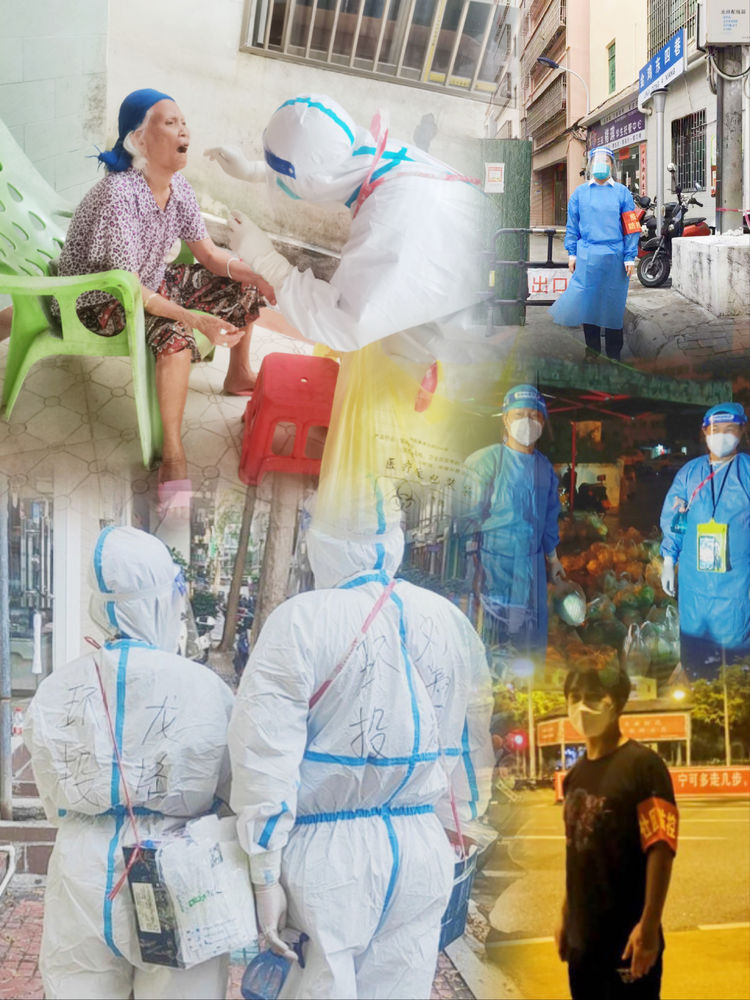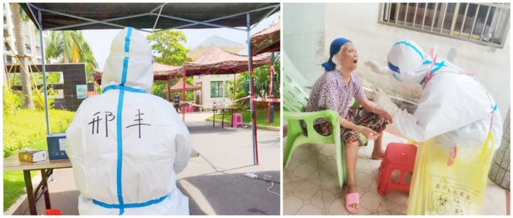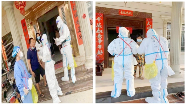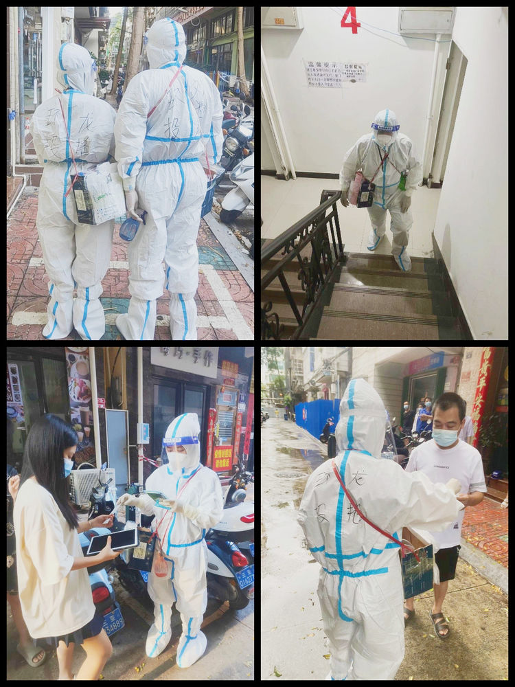 設計院公司職工鄭云華和林福星兩人主要負責回輝社區核酸點(diǎn)信息采集、核酸點(diǎn)維持秩序、搬運防疫物資、上門(mén)貼封條等工作。無(wú)論晴雨黑白,都能看到他們服務(wù)的辛勞身影。他們或是堅守在執勤點(diǎn)位上風(fēng)吹日曬,或是在高風(fēng)險區一棟棟爬樓入戶(hù)采集。為了避免感染,他們穿著(zhù)密不透風(fēng)的防護服工作,在高溫下工作幾小時(shí)后,全身濕透,手套里全是汗水。他們齊心協(xié)力,共同抗疫,為三亞貢獻防疫力量。