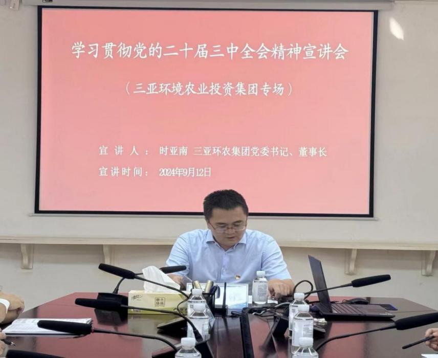 9月12日下午,三亞環(huán)農集團舉辦學(xué)習貫徹黨的二十屆三中全會(huì )精神宣講會(huì ),集團黨委書(shū)記、董事長(cháng)時(shí)亞南作題為《學(xué)習貫徹黨的二十屆三中全會(huì )精神,助力全面深化改革推動(dòng)企業(yè)高質(zhì)量發(fā)展》的全會(huì )精神專(zhuān)題宣講,集團本部共計50余名黨員參加宣講活動(dòng)。