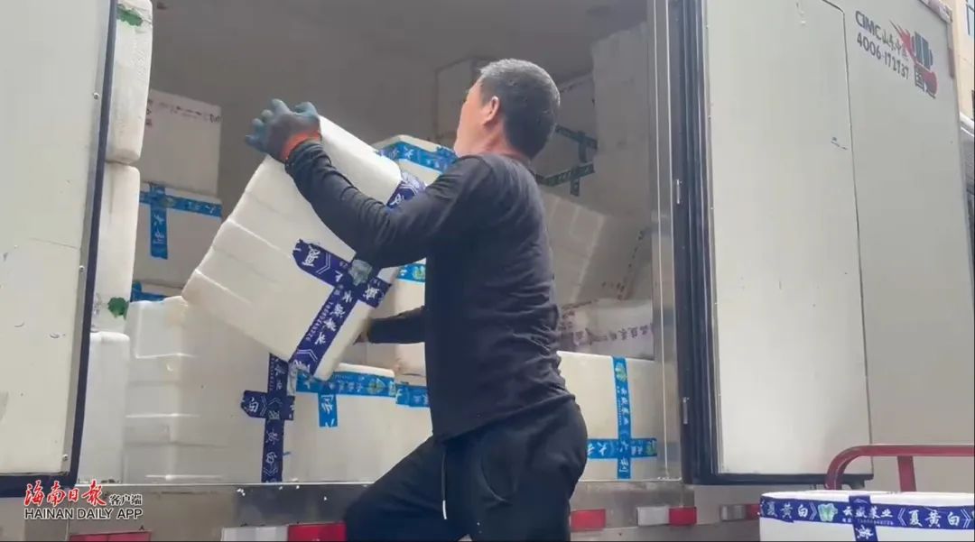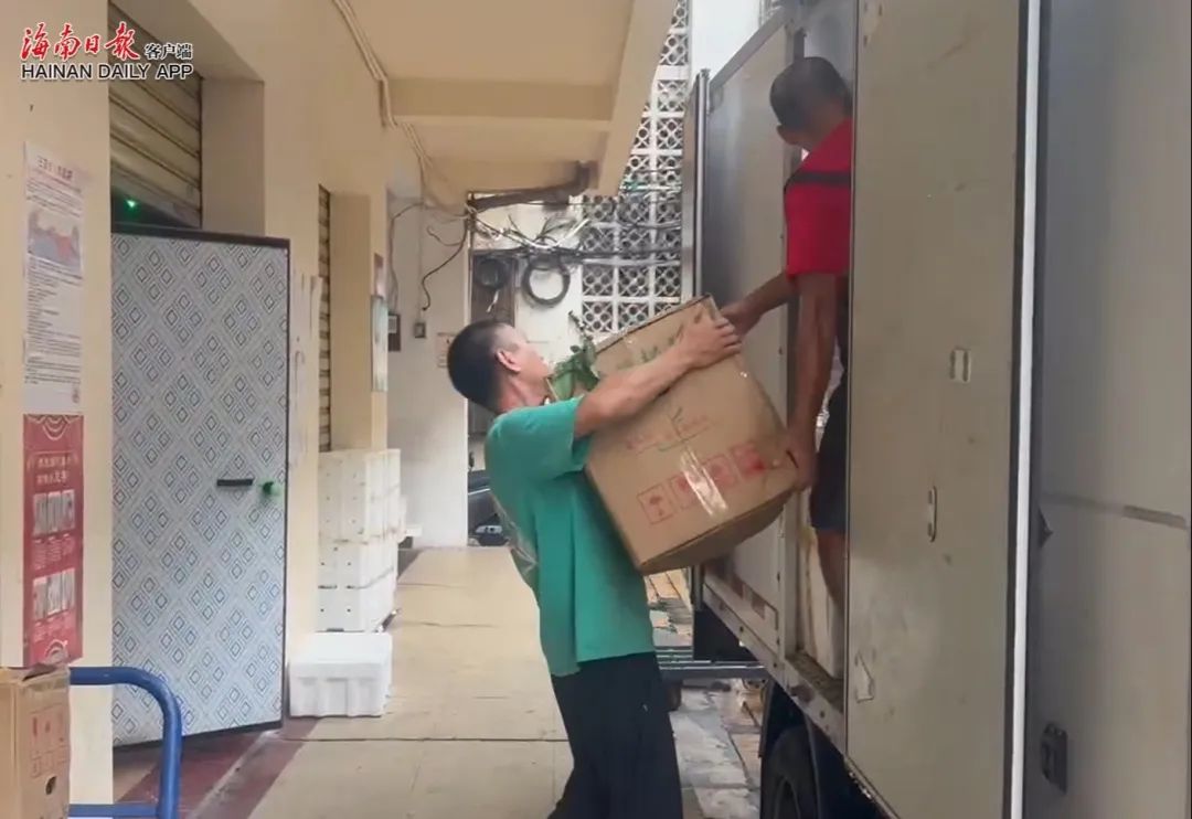從島外直采直供的蔬菜被工人搬下車(chē),送至冷鏈倉儲中心。海南日報全媒體記者 劉杰 攝