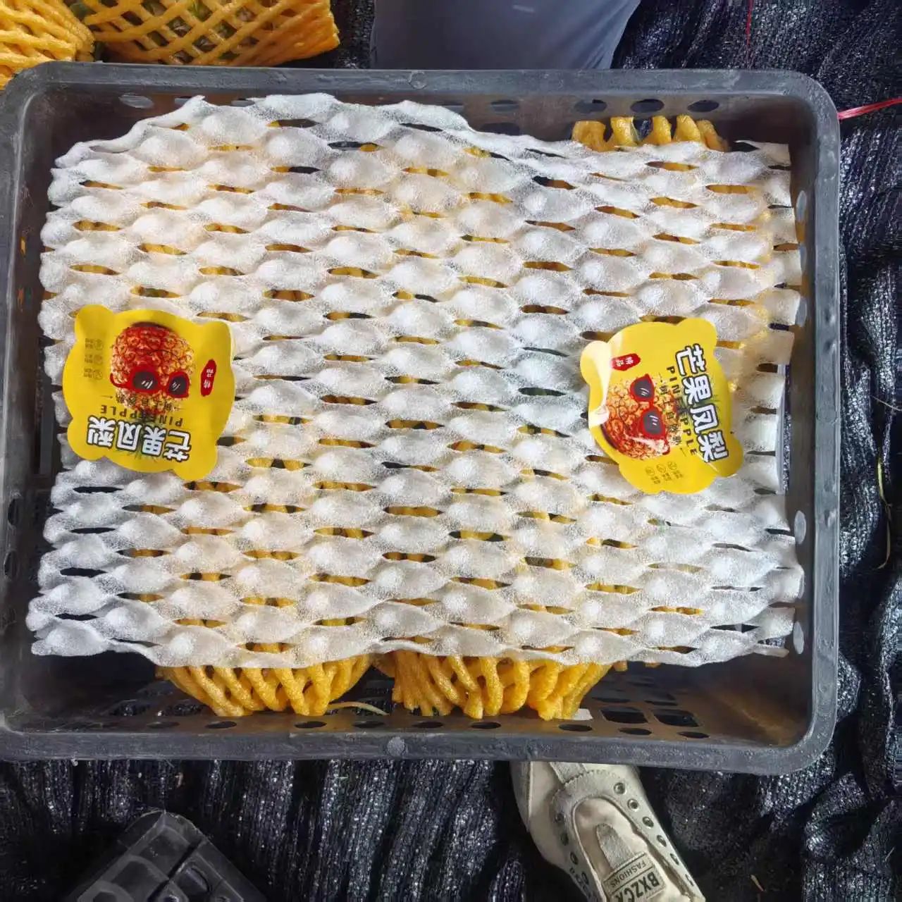 工人忙著(zhù)將采摘下來(lái)的芒果鳳梨裝箱打包。