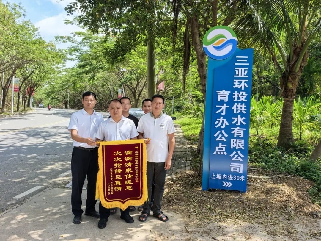6月19日,三亞市育才生態(tài)區居民代表將一面印有“滴滴清泉傳暖意,次次搶修見(jiàn)真情”金色大字的錦旗,送至三亞環(huán)農集團旗下三亞環(huán)投供水有限公司(以下簡(jiǎn)稱(chēng)“環(huán)投供水公司”),感謝工作人員在臺風(fēng)“蝴蝶”影響期間,不畏艱險、爭分奪秒開(kāi)展應急搶修工作,有力保障了居民用水安全和生命財產(chǎn)安全。