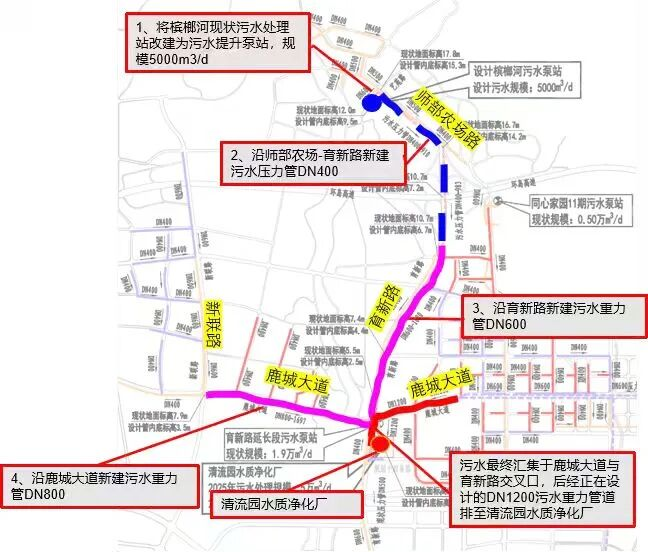 該項目的實(shí)施,將解決該片區污水管道終端出處的問(wèn)題,撤除檳榔河現狀臨時(shí)污水處理站,新建規模為5000m3/d的污水提升泵站,并在師部農場(chǎng)路、育新路及鹿城大道擴容升級污水管道,將檳榔河片區及妙林片區的污水轉輸接入育新路污水提升泵站,近期排入荔枝溝水質(zhì)凈化廠(chǎng)處理,遠期經(jīng)育新路污水主管道接入清流園水質(zhì)凈化廠(chǎng)處理,全面解決以往污水處理能力不足、污水集中收集率不高等問(wèn)題,改善周邊群眾的生活環(huán)境。