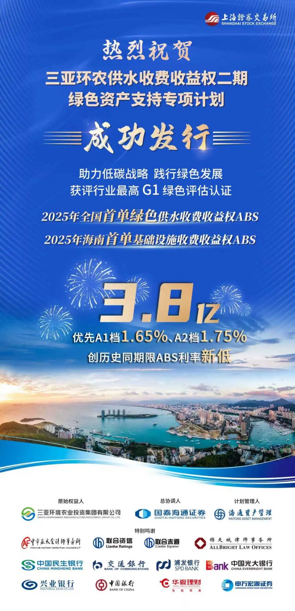 9月18日,三亞環(huán)農集團成功發(fā)行2025年全國首單綠色供水收費收益權ABS和2025年海南首單基礎設施收費權益權ABS,募集資金3.8億元,優(yōu)先級01、02檔均創(chuàng )下全國同期限ABS產(chǎn)品利率歷史新低,綜合利率低至2.28%,最低利率僅為1.65%,充分彰顯監管機關(guān)及投資人對公司創(chuàng )新能力、資產(chǎn)質(zhì)量及運營(yíng)能力和主體資質(zhì)的肯定與認可。這是環(huán)農集團繼2022年10月發(fā)行海南首單供水收費收益權綠色資產(chǎn)支持專(zhuān)項計劃后、致力于提升融資能力的又一重大成就,既展現了公司在資產(chǎn)證券化領(lǐng)域的強勁實(shí)力,也凸顯了響應國家綠色金融政策、助力地方經(jīng)濟發(fā)展的決心。