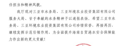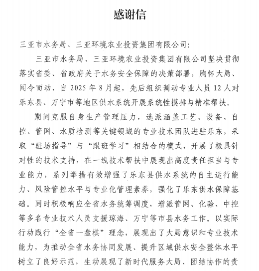 近日,省水務(wù)廳向三亞環(huán)農(nóng)集團(tuán)發(fā)來感謝信,對(duì)集團(tuán)在支持樂東等市縣供水技術(shù)提升、積極響應(yīng)全省水務(wù)調(diào)度安排中作出的貢獻(xiàn)給予高度肯定。信中指出,三亞環(huán)農(nóng)集團(tuán)堅(jiān)決貫徹全省水務(wù)工作部署,統(tǒng)籌指導(dǎo)下屬單位落實(shí)對(duì)口支援任務(wù),以實(shí)際行動(dòng)踐行“全省一盤棋”理念,為強(qiáng)化區(qū)域供水保障、推動(dòng)全省水務(wù)事業(yè)協(xié)同發(fā)展樹立了榜樣。